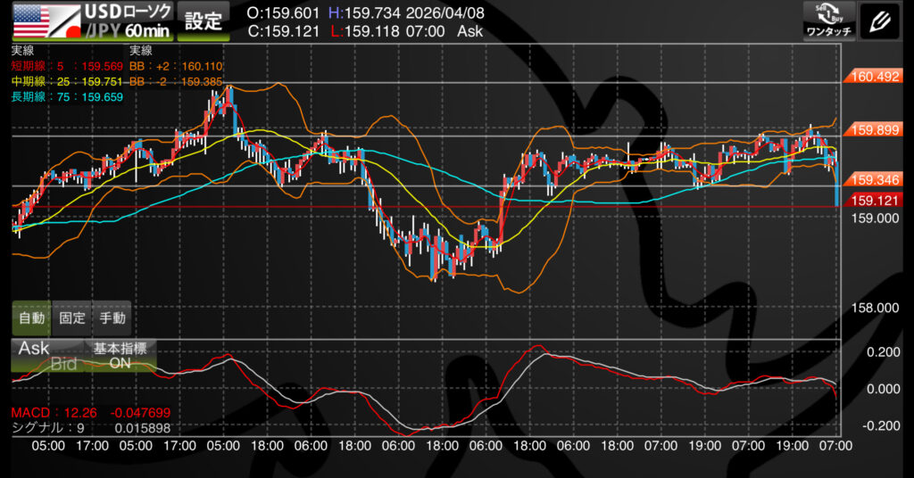 159.00円を明確にローソク足の実体で割り込み、中期MAが長期MAをデッドクロスした場合に勝負をかけます。