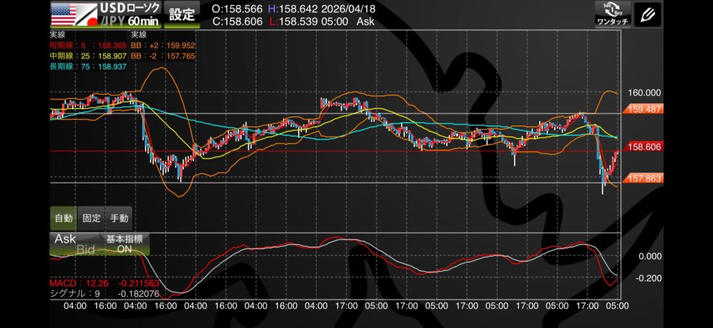 2026年4月18日土曜日、今週のドル円相場がクローズしました。直近では159.50付近から157.80付近までの大きな乱高下があり、週明けの動向に注目が集まっています。