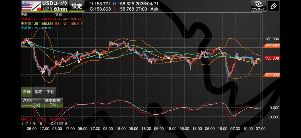 2026年4月21日 07:00時点のチャート状況に基づき、現在のドル円相場を診断します。大きな下落を経て、現在は157.86円から159.48円のレンジ内で「次の方向性」を探る非常にデリケートな局面です。